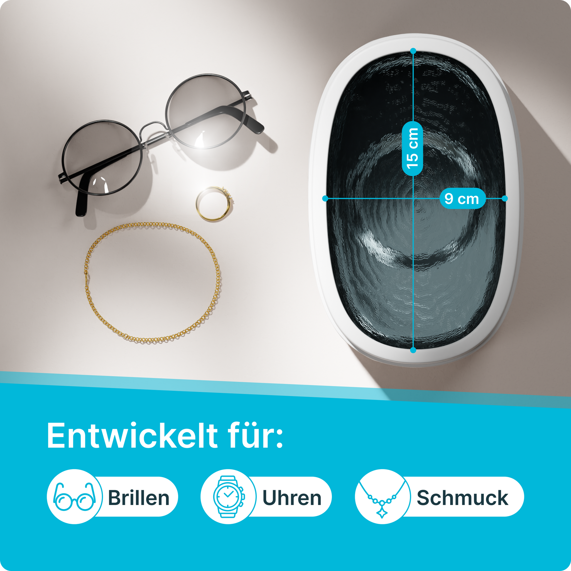 Ultraschallwellen lösen schwer erreichbaren Schmutz aus kleinsten Zwischenräumen. Schonend und trotzdem wirksam. Sehr gut geeignet für die Reinigung von Brillen. Besonders in Kombination mit dem Klarberg Ultraschallreiniger Konzentrat. Ebenfalls bestens geeignet für die Reinigung von Schmuck wie Ringen, Armreife, Ketten und vieles mehr.